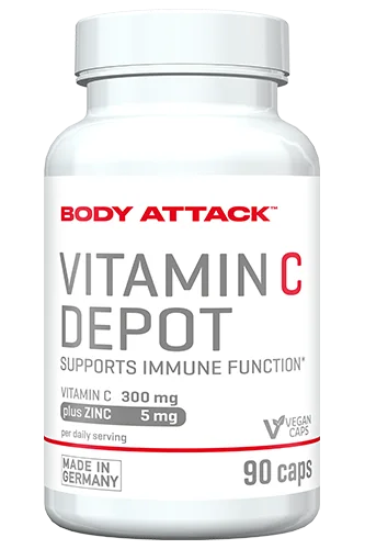 ویتامین سی دپات بادی اتک BODY ATTACK Vitamin C-Depot plus Zinc حاوی اسید ال اسکوربیک و ماده معدنی روی است. هر دو ماده مغذی به عملکرد سیستم ایمنی کمک میکنند و سلولها را از استرس اکسیداتیو محافظت میکنند، که بهعنوان مثال ایجاد میشود. فعالیت بدنی زیاد در حین ورزش یا استرس روحی.