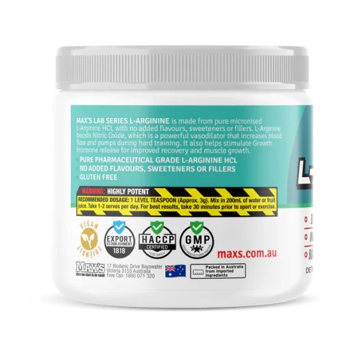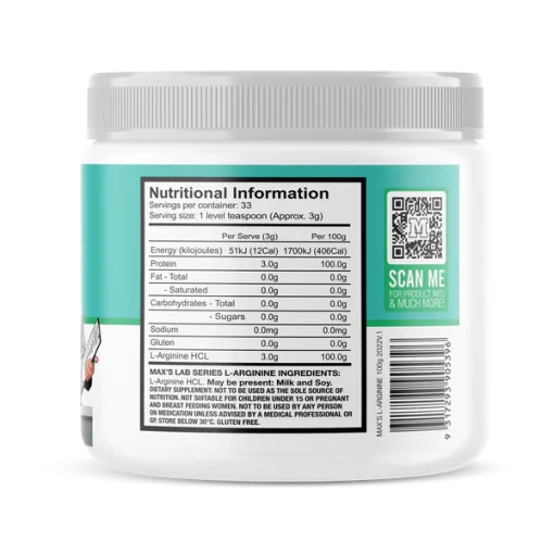 ال آرژنین مکسس MAX’S L-ARGININE با استفاده از ال آرژنین HCL میکرونیزه شده خالص و بدون طعم دهنده، شیرین کننده یا فیلر ساخته شده است. ال-آرژنین اکسید نیتریک را تقویت می کند، که یک گشادکننده عروق قوی است که جریان خون را افزایش می دهد و در طول تمرینات سخت پمپ می کند. همچنین به تحریک ترشح هورمون رشد برای بهبود ریکاوری و رشد عضلات کمک می کند.