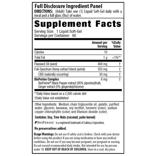 هر سافت ژل حاوی 30 میلیگرم CBD با کیفیت عالی است که از عصاره کنف طیف کامل تهیه شده است. این عصاره همراه با روغنهای مغذی مانند روغن بذر کتان و روغن MCT ترکیب شده تا علاوه بر تأثیرات مثبت CBD، مزایای تغذیهای بیشتری نیز ارائه شود.