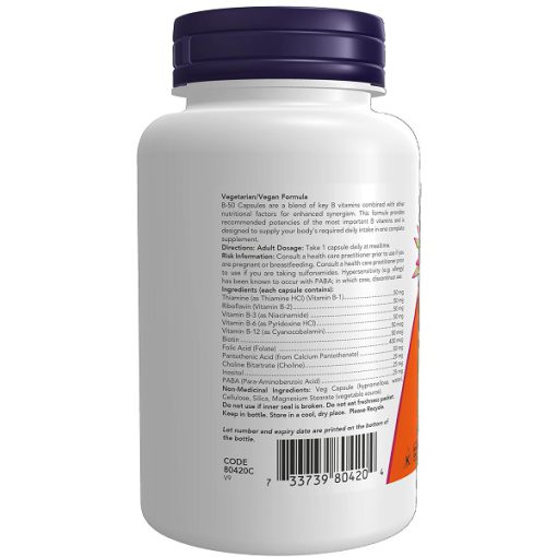 NOW® Vitamin B50 یک مکمل جامع از ویتامینهای گروه B است که به همراه کولین و اینوزیتول، پشتیبانی کامل از سلامت عمومی، تولید انرژی، و عملکرد سیستم عصبی را ارائه میدهد. این محصول با فرمول بدون آلرژن و تولید شده در شرایط استاندارد GMP، گزینهای مناسب برای برآورده کردن نیازهای روزانه به ویتامینهای B و حفظ سلامتی کلی است.