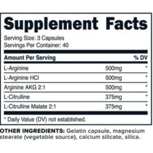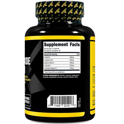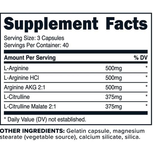 هر بطری از این مکمل حاوی 120 کپسول است که 40 وعده سخاوتمندانه را ارائه میدهد. فرمول قدرتمند این مکمل ترکیبی از ترکیبات با دقت انتخاب شده از جمله ال-آرژنین، ال-آرژنین HCl، آرژنین AKG 2:1، ال سیترولین و ال سیترولین مالات 2:1 را شامل میشود. این ترکیبات به طور کلی 2250 میلیگرم اکسید نیتریک در هر وعده را ارائه میکنند.