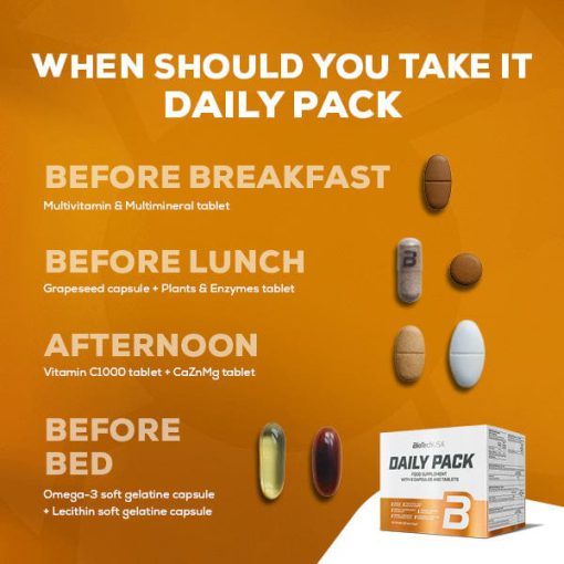 دیلی پک بایوتک با قرص ها و کپسول های مکمل غذایی به صورت پک حاوی ویتامین ها، مواد معدنی، امگا 3، لسیتین و عصاره های گیاهی است. مکمل بایوتک با ترکیباتی که به محافظت از سلول ها در برابر استرس اکسیداتیو کمک می کند.