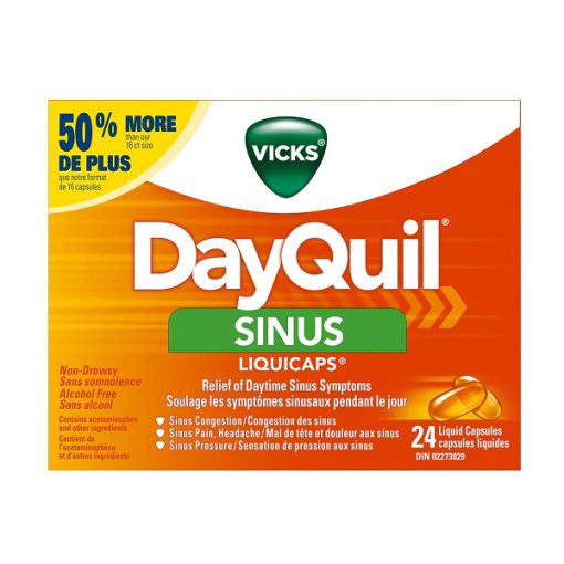تسکین دهنده درد سینوس دی کویل Vicks DayQuil SINUS یکی از مسکن هایی است که برای استفاده در طول روز طراحی شده است. شما می توانید این محصول را همراه با NyQuil استفاده کنید و علائم سرماخوردگی خود را درمان کنید. DayQuil SINUS مشکلات سینوزیت را به طور موقت تسکین می دهد که از این بین می توان به درد سینوسی، سردرد سینوسی، گرفتگی بینی و احتقان سینوس اشاره کرد.