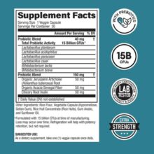 علاوه بر پروبیوتیکها، این مکمل حاوی ترکیبات پریبیوتیکی مانند فیبر آرتیشو اورشلیم، فیبر آکاسیا سنگال و اینولین ریشهی کاسنی است که نقش مهمی در تغذیهی باکتریهای مفید ایفا کرده و اثربخشی پروبیوتیکها را افزایش میدهند.