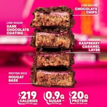 ترکیب پروتئین (کلسیم کازئینات (شیر)، پروتئین وی (شیر)، کنسانتره پروتئین وی هیدرولیز شده (شیر))، شکلات تلخ با شیرین کننده (20%) (کاکائو، شیرین کننده: مالتیتول، کره کاکائو، امولسیفایر) طعم دهنده طبیعی)، مرطوب کننده: گلیسرول. آب، پودر کاکائو، روغن پالم، فیبر غذایی: پلی دکستروز. شکلات سفید با شیرین کننده (شیرین کننده: مالتیتول، کره کاکائو، پودر شیر کامل، امولسیفایر: لسیتین ها (سویا)؛ طعم دهنده طبیعی)، چیپس کاکائو سویا (پروتئین سویا، پودر کاکائو، نشاسته تاپیوکا)، طعم دهنده طبیعی، پودر کم چرب، کنسانتره رزبری، مالتودکسترین، تنظیم کننده اسیدیته: اسید سیتریک؛ شیرین کننده: سوکرالوز؛ کنسانتره (هویج، توت سیاه). همچنین ممکن است حاوی غلات حاوی گلوتن، بادام زمینی و آجیل باشد.