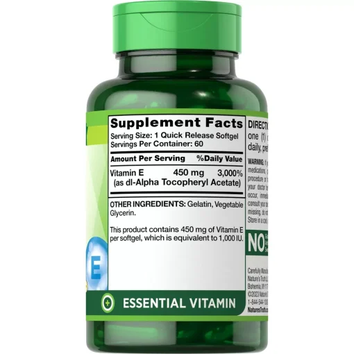فرمول با قدرت بالا: هر کپسول این مکمل حاوی 1000 IU (450 میلیگرم) ویتامین E است که مقدار قابل توجهی از این ویتامین را در اختیار بدن قرار میدهد.