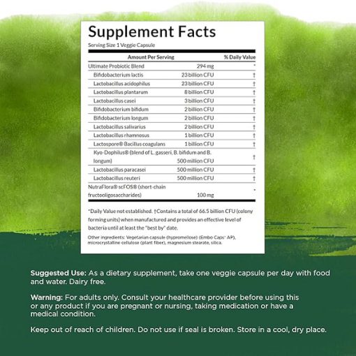 این مکمل شامل NutraFlora scFOS (100 میلیگرم) است که یک نوع پریبیوتیک است. پریبیوتیکها مواد غیر قابل هضم هستند که به تغذیه و رشد باکتریهای مفید روده کمک میکنند. این ترکیب به تقویت عملکرد پروبیوتیکها و بهبود سلامت روده کمک میکند.