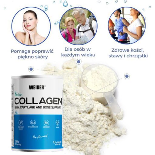 کلاژن پپتان ویدر حاوی کلاژن برای سلامت پوست، استخوان و غضروف و منیزیم، هیالورونیک اسید برای شادابی پوست و مفاصل است. کلاژن، پروتئین حیاتی موجود در بافت همبند، برای حفظ خاصیت ارتجاعی و ارتقاء بازسازی در پوست، استخوان ها و غضروف بسیار مهم است.