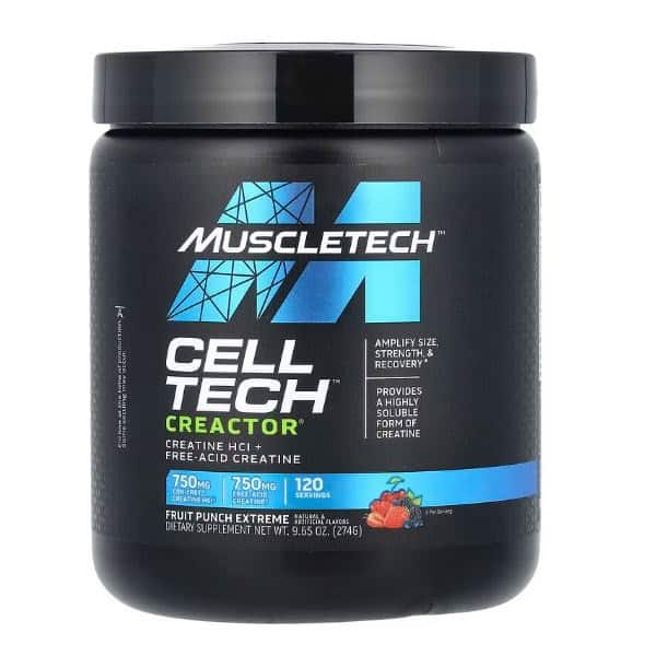 کراتین ترکیبی کریکتور ماسل تک 274 گرم MuscleTech Cell-Tech Creactor یک مکمل کراتین پیشرفته است که برای افزایش قدرت، حجم عضلانی خشک و بهبود ریکاوری ساخته شده است. این محصول در هر وعده ترکیبی از دو نوع کراتین با خلوص بالای کراتین هیدروکلراید (HCL) و کراتین Free-Acid را ارائه می دهد و فاقد قند، کربوهیدرات و چربی است. بنابراین یک راه حل موثر برای ورزشکارانی است که به دنبال عملکرد بهتر، رشد عضلانی سریع تر و ریکاوری موثرتر هستند.